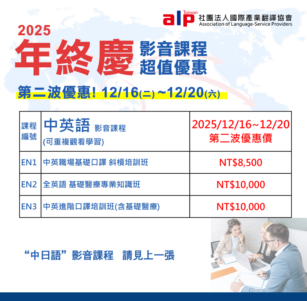 12/10~12/20 前10位報名之學員 → 享有 #免費口譯力分析 15分鐘 ( 定價 NT 2,000)